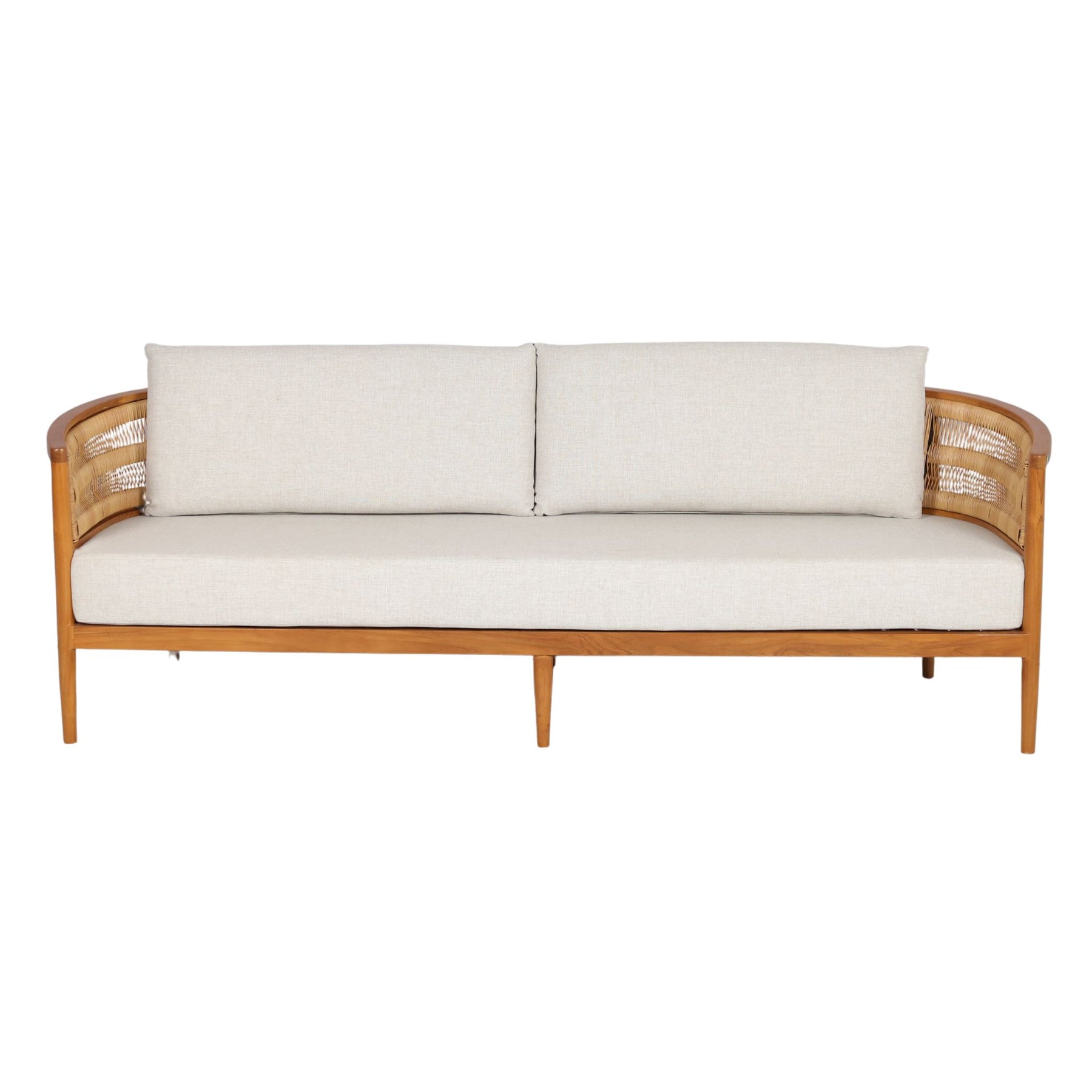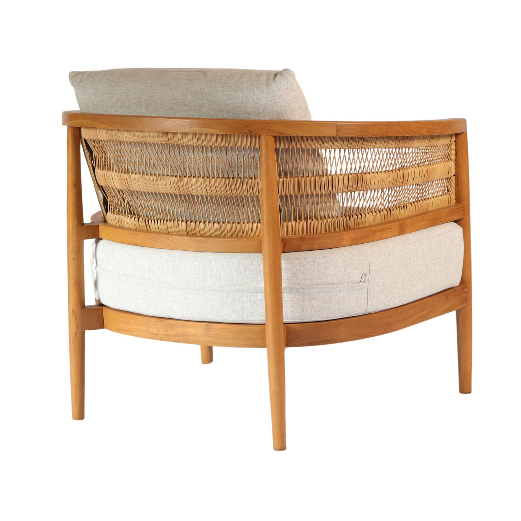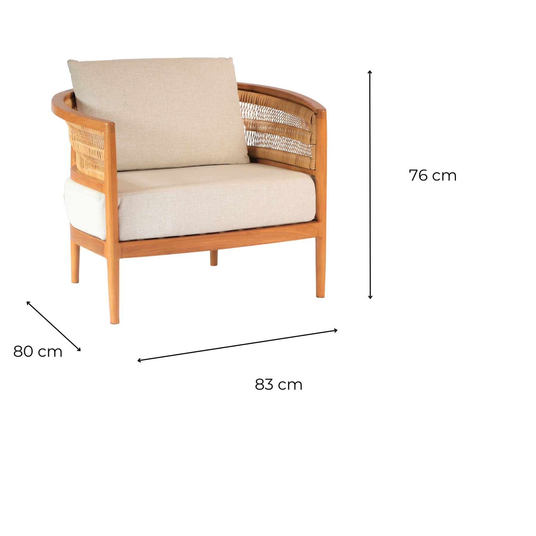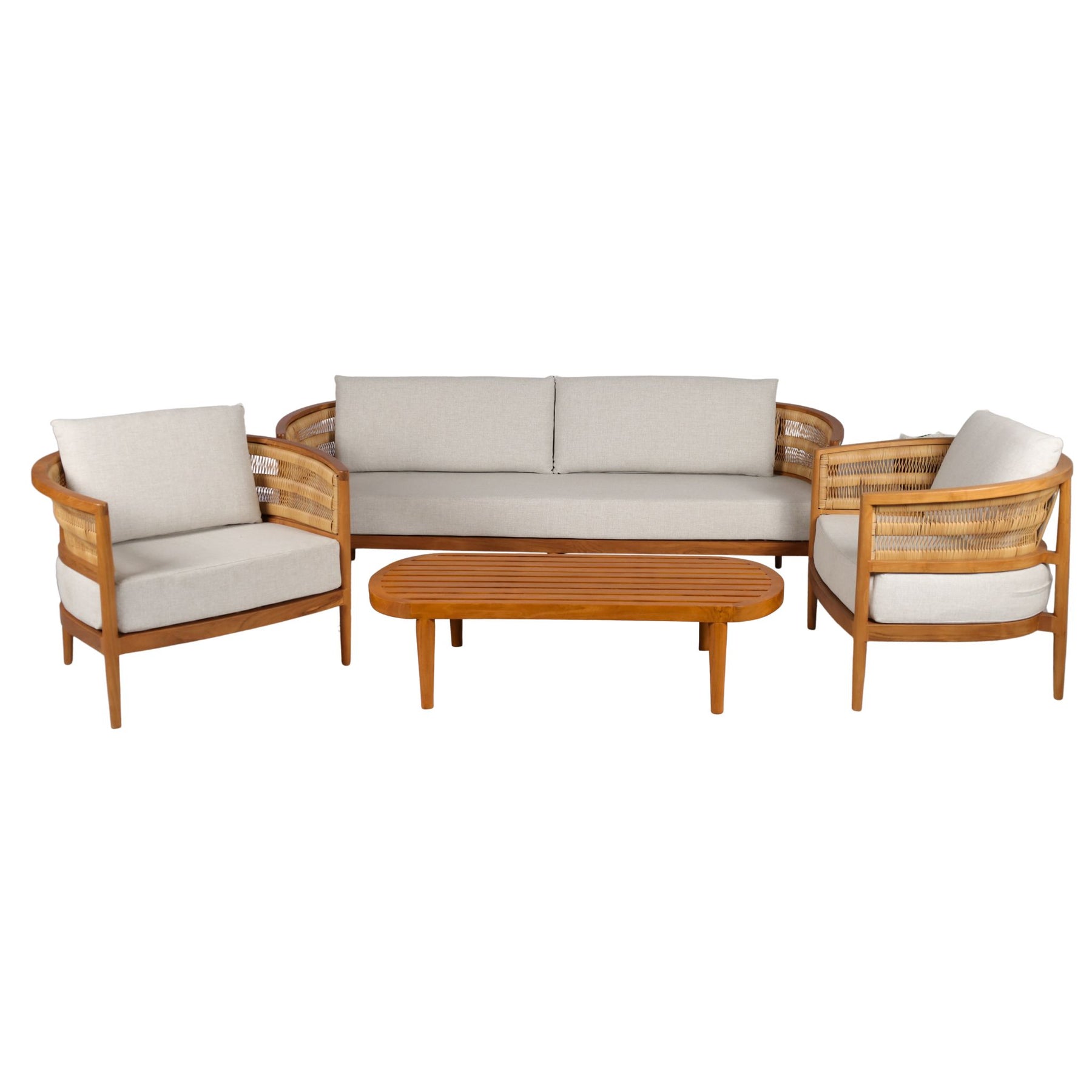 Bienvenue dans l'univers de relaxation avec le salon Rey, conçu pour transformer votre espace extérieur en un sanctuaire de confort et de style. Ce set élégant se compose d'un sofa spacieux, de deux fauteuils accueillants et d'une table basse fonctionnelle, tous fabriqués en teck robuste et agrémentés de tressages en rotin synthétique de haute qualité, résistant aux intempéries.
